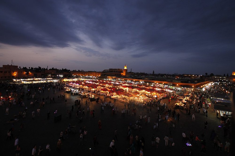 Cross the Atlas Mountains to Marrakech. Evening at Jemaa el-Fnaa square.